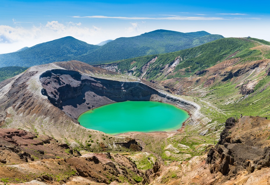 蔵王御釜はお釜のような形からその名がつけられ、深緑やブルーなど太陽の光によって色を変える神秘的な光景です。